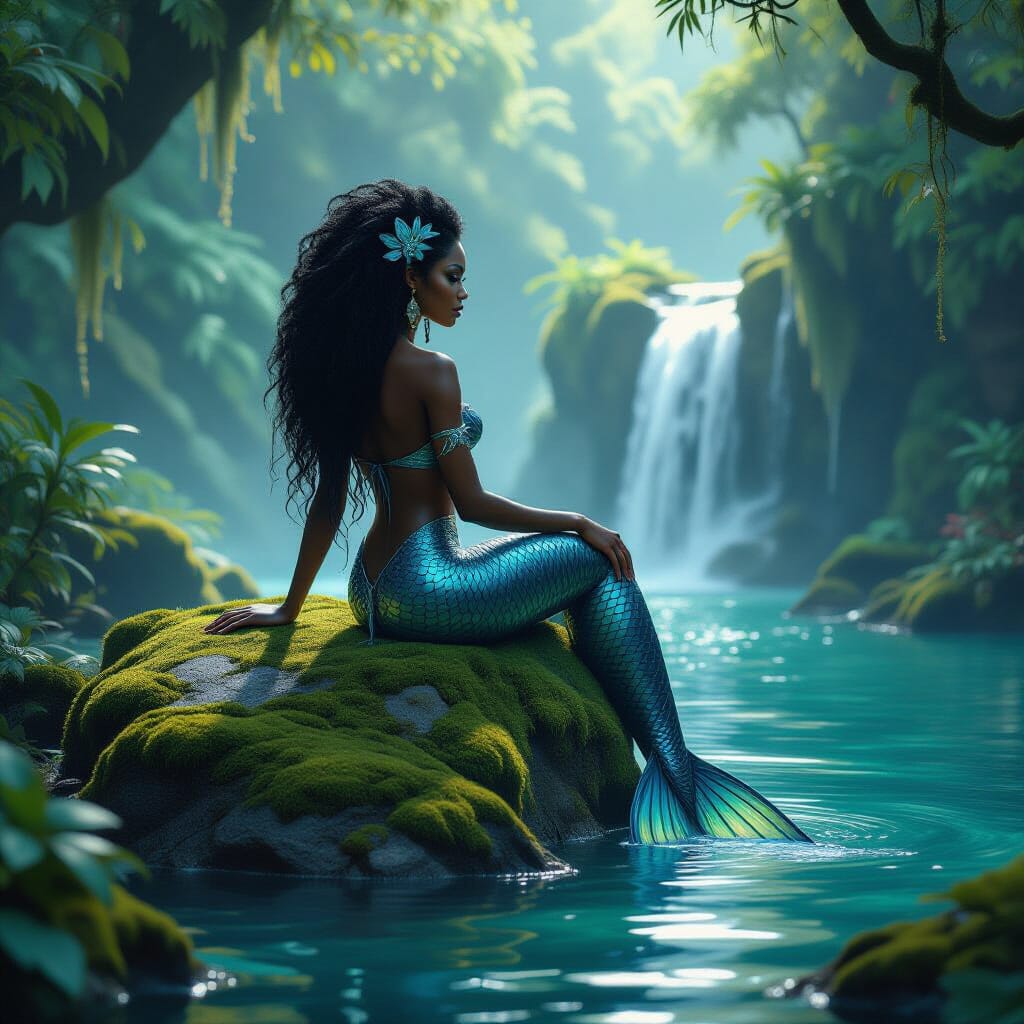 The mermaid sits perched on a moss-covered ancient stone. The magnificent view overlooks a hidden waterfall cascading into a crystal-clear lagoon. Lush flora surrounds the scene, casting a soft, tranquil glow. There is a feeling of peace blending hyper-realistic fantasy concept art with macrophotography, emphasizing the textures of the moss, water, and scales.
