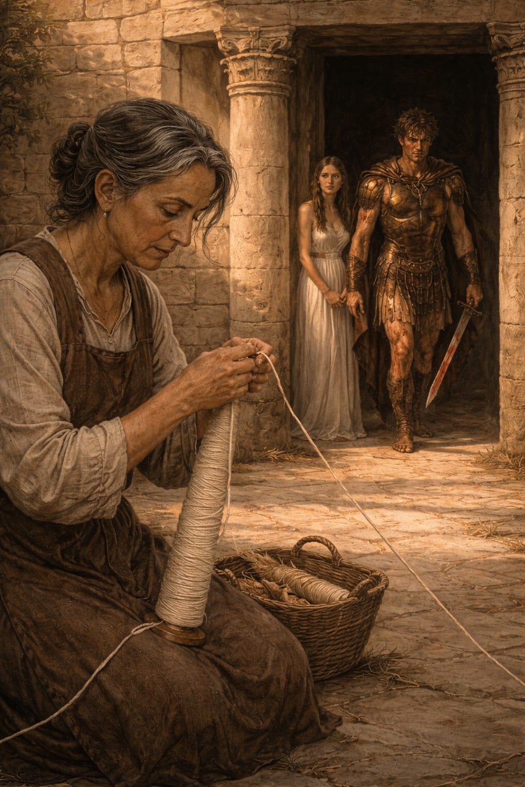 She lived in a low room near the outer walls of Knossos, where the air always smelled faintly of olive oil and dust. The room had two narrow windows and a wooden loom that creaked whenever the wind came from the sea.
