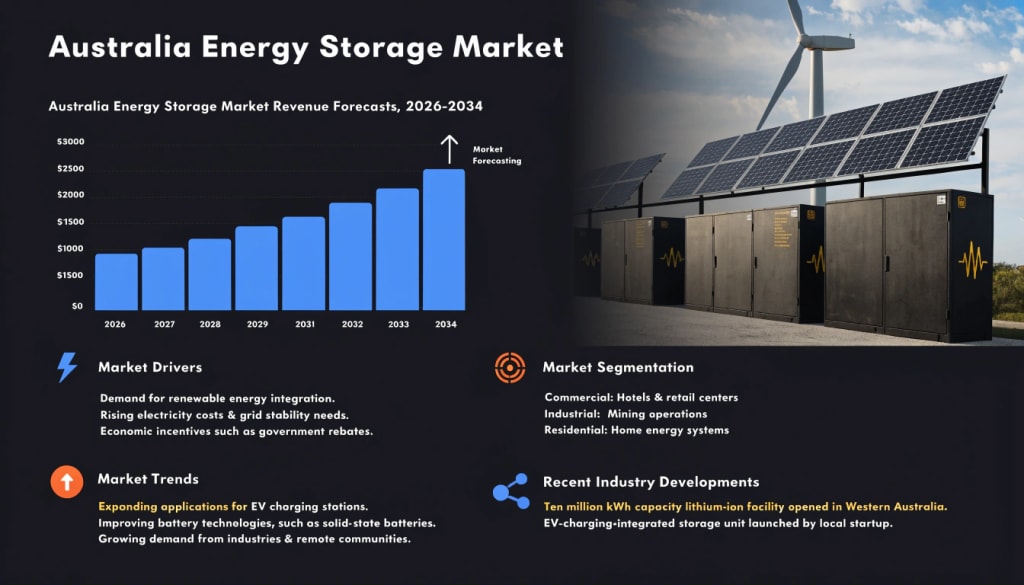 Australia Energy Storage Market: Utility-Scale Battery Deployment, Renewable Energy Integration & Grid Stability Solutions