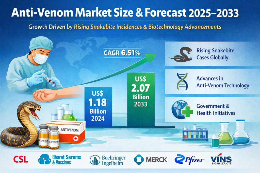 The global anti-venom market continues to gain momentum as governments, pharmaceutical companies, and public health organizations intensify efforts to address the growing threat of venomous animal bites. According to market estimates, the global anti-venom market was valued at approximately US$ 1.18 billion in 2024 and is projected to expand at a compound annual growth rate (CAGR) of 6.51% between 2025 and 2033, reaching around US$ 2.07 billion by 2033.